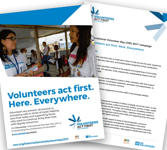 Our IVD 2017 Resource Centre has all the graphic elements you need to spread the word that #VolunteersActFirst in times of crisis, including the logo, posters, banners, web graphics and examples for social media, all in the six UN official languages.