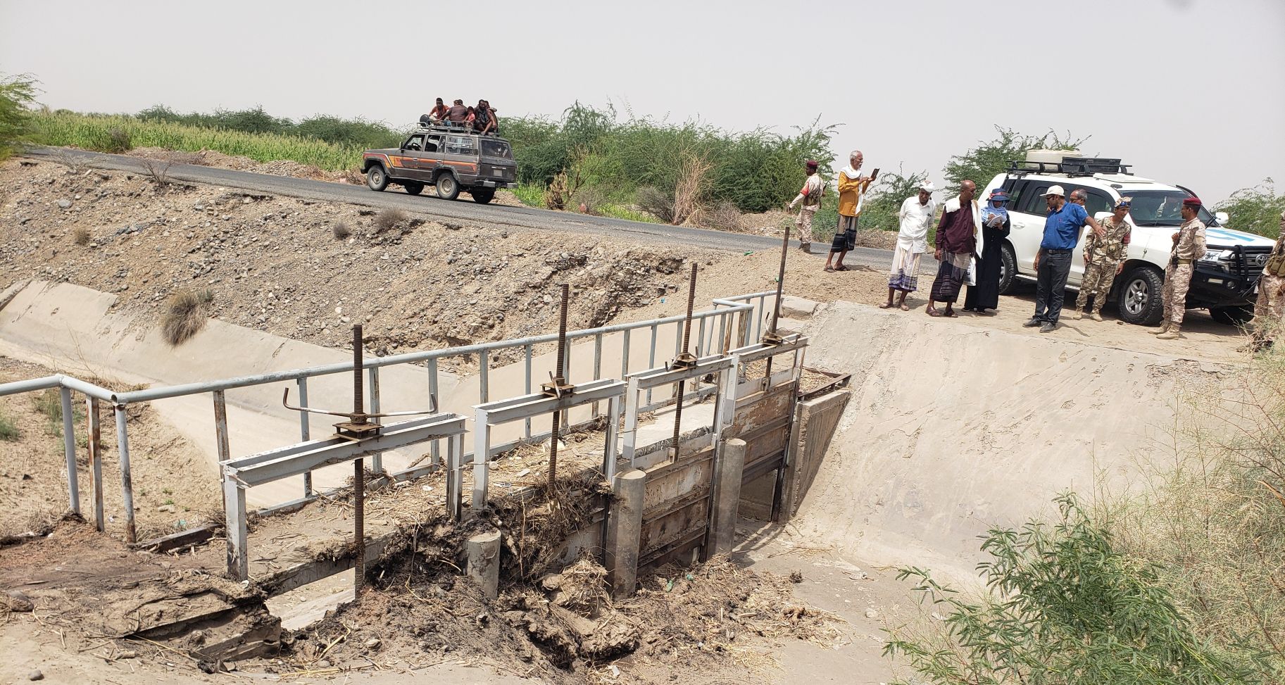 Volunteers at a site visit to assess the conditions of irrigation systems in Tuban district of Lahj, Yemen.