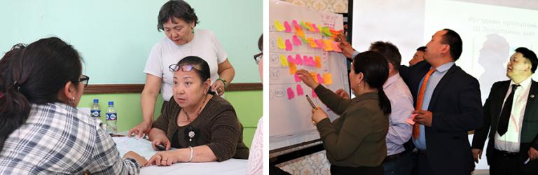 Elected Hural representatives of Selenge aimag attending the Women Leadership Training (left) and others in Dornod aimag brainstorming on the Ladder of Citizen Participation during leadership training. Both activities were organized as part of the UNDP project 'Strengthening Representative Bodies in Mongolia'. (UNV, 2018)