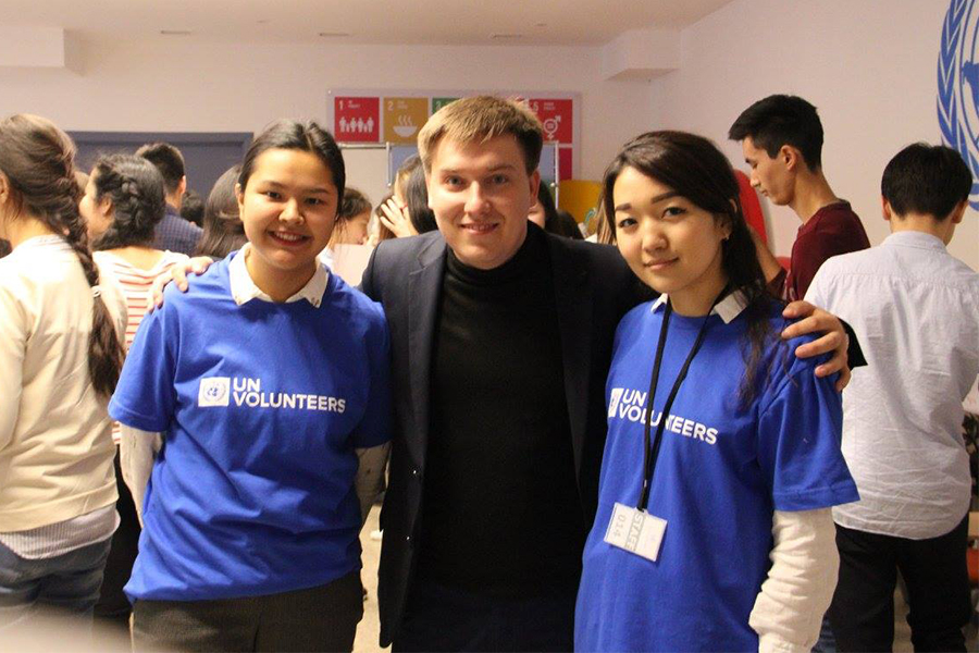 National UN Volunteers Dina Akylbekova, Nikita Shabayev and Assel Bissenali in Nur-Sultan, Kazakhstan. ©UNV, 2017