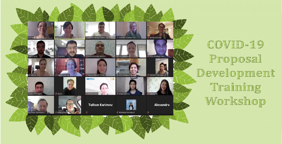 UN Volunteer Ayaka Naito (top row, second from left) together with facilitators and participants in a COVID-19 Proposal Development Training workshop.