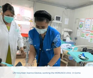 Joanna Gbotoe is a Liberian nurse serving at The United Nations Organization Stabilization Mission in the Democratic Republic of the Congo (MONUSCO) in the medical section. Since the beginning of the COVID-10 outbreak, she has played a key role in the Mission regarding prevention activities. Her work involves detecting suspected cases, providing essential treatment, helping in decontamination, and coordinating patient's evacuation.