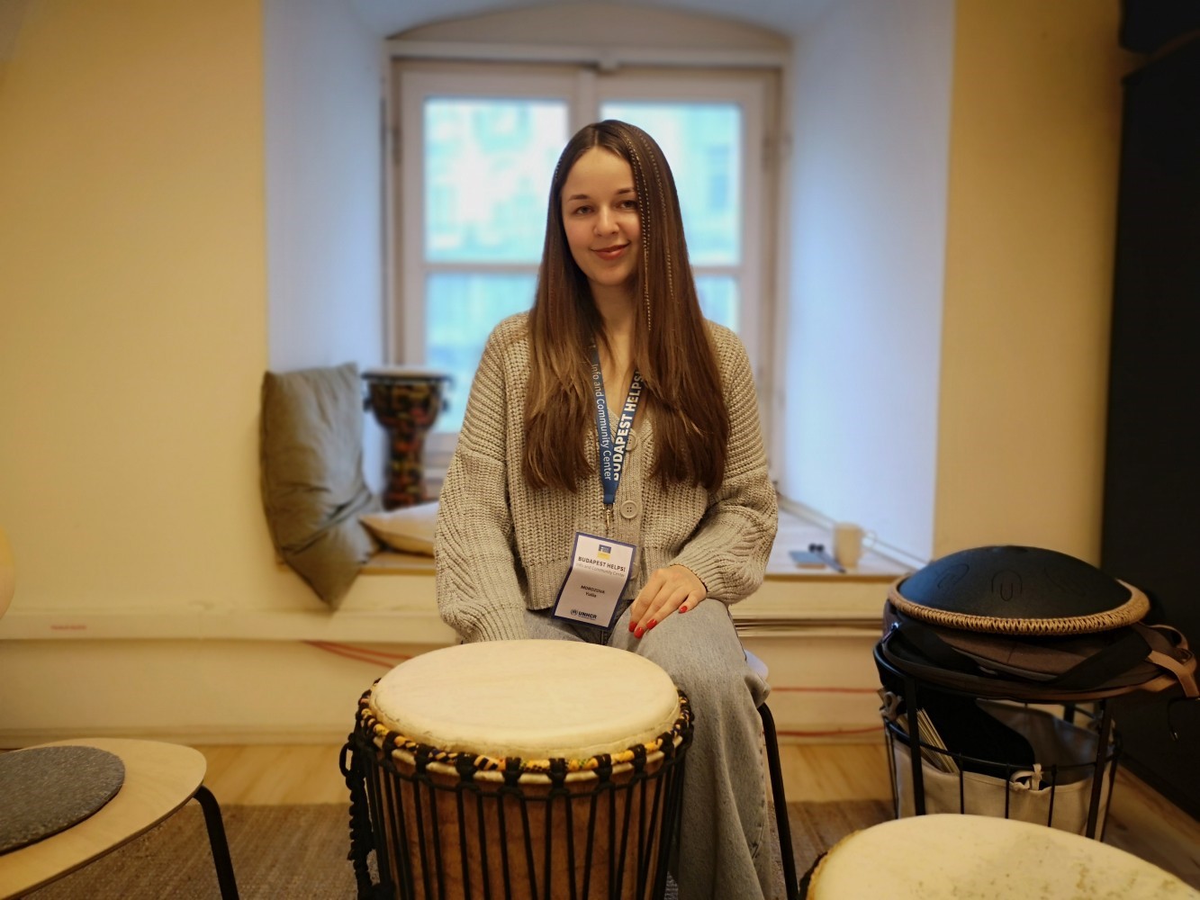 Yuliia Morozova has been serving as Cultural Coordinator in the Center since October 2022. She fled to Hungary with her two children right after the war broke out in Ukraine. For her, it was crucial to help her fellow citizens from the very beginning; Yuliia leads drum workshops for youth and adults, among other cultural and recreational activities, and finds the experience incredibly enriching.