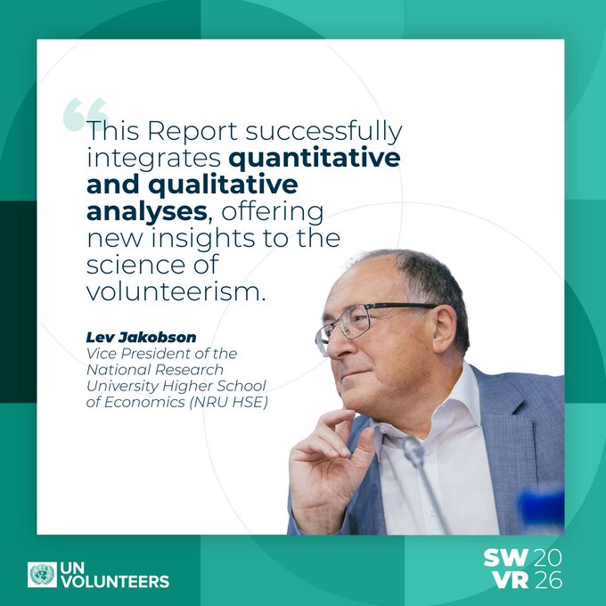 Professor Lev Ilyich Jakobson is Vice President of the Higher School of Economics and Academic Supervisor of the Center for Studies of Civil Society and the Nonprofit Sector. A Doctor of Economics, he served on the UNV High-Level Advisory Group for the 2026 SWVR.