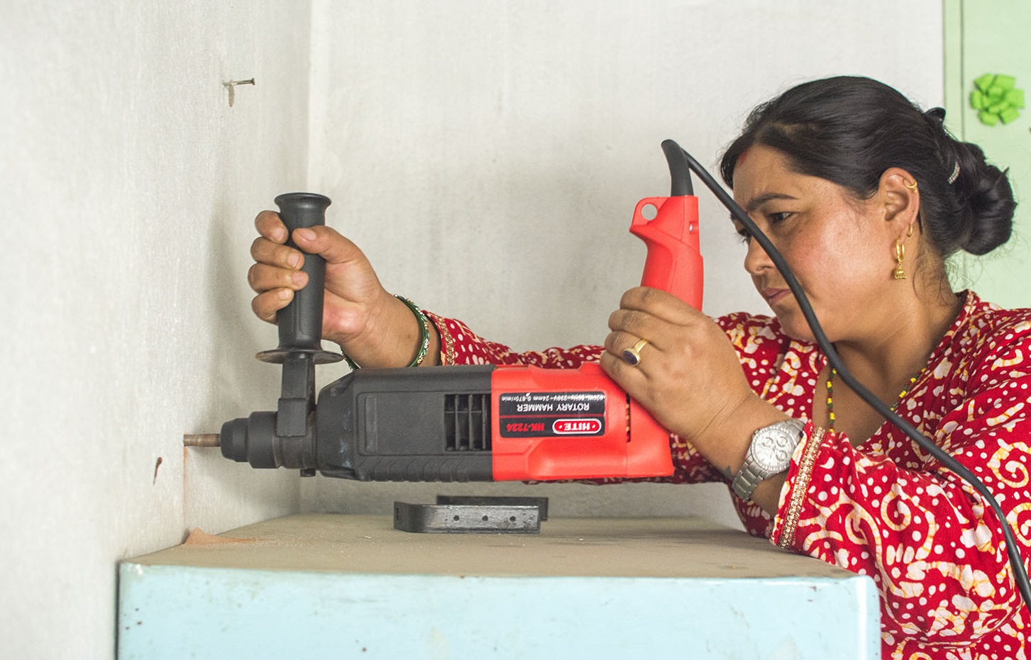 A group of women who had previously been trained by the National Society for Earthquake Technology (NSET) to protect their own homes using non-structural approaches, such as screwing cupboards, photo frames and their fridges to the wall, were mobilised to put their skills to use across the community.