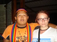 Lies Vervloet (derecha), pasante VNU cuya asignación es íntegramente financiada por el Gobierno de Bélgica, junto a un joven indígena Shuar, uno de los participantes en el seminario de jóvenes líderes indígenas. (Programa VNU)