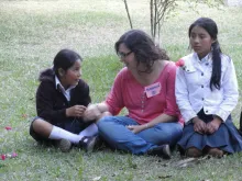 Maddalen Yarza (centro), Voluntaria Universitaria del programa VNU, con dos niñas de la Nueva Escuela Unitaria Bilingüe Intercultural de la Aldea Santa Clara Cunén del Quiché. (Programa VNU)