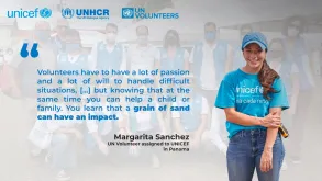 Los Voluntarios y Voluntarias ONU deben tener mucha pasión y voluntad para navegar situaciones difíciles, […] pero, al mismo tiempo, sabes que puedes ayudar a un niño/a o una familia. Aprendes que cada granito de arena puede tener un impacto -- Margarita Sánchez, Voluntaria ONU, UNICEF Panamá
