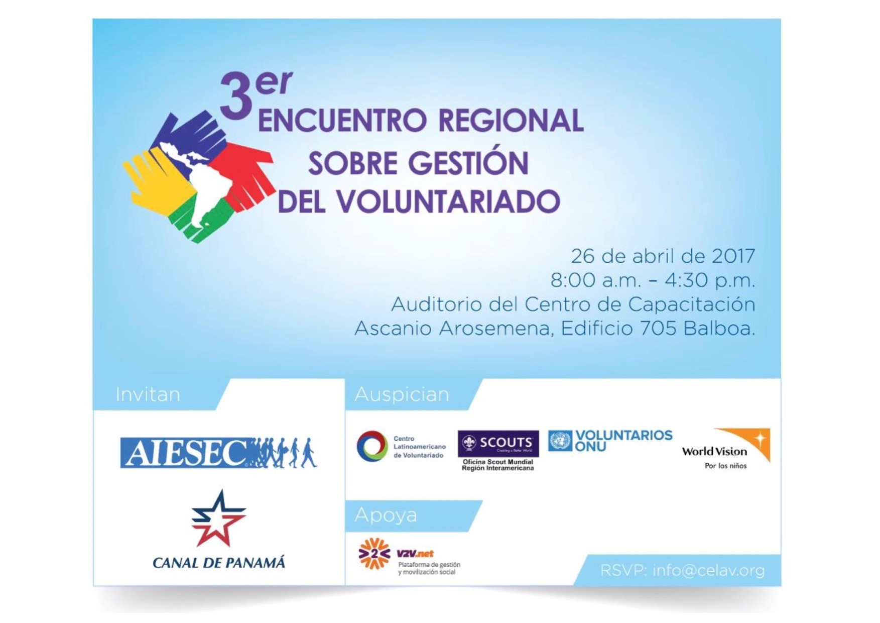 El Encuentro está organizado por AIESEC y la Autoridad del Canal de Panamá (ACP), con el auspicio de la Oficina Scout Mundial-Centro de Apoyo Interamérica, World Vision, el Centro Latinoamericano de Voluntariado (CELAV), y la oficina regional del programa de Voluntarios de las Naciones Unidas (VNU).