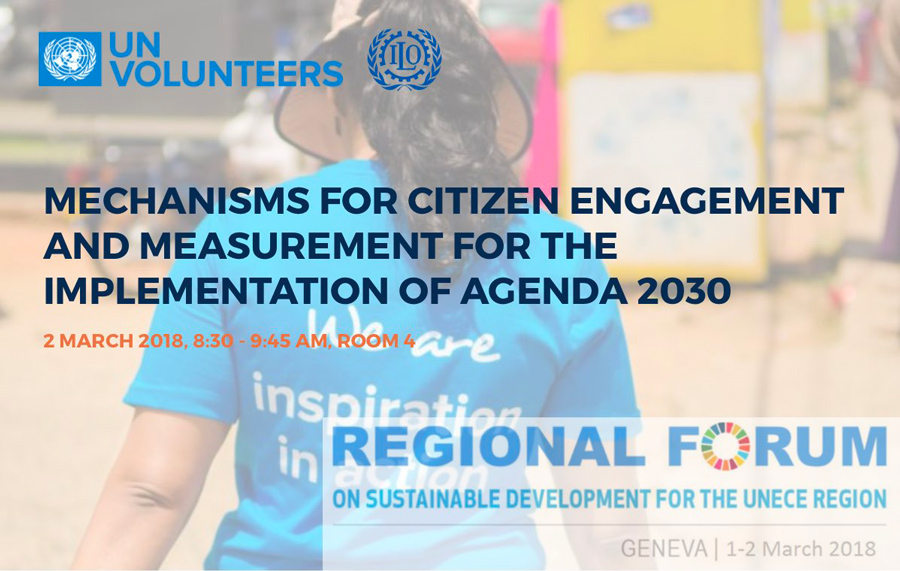On 2 March, the United Nations Volunteers and the International Labour Organization are jointly organizing a side event on "Mechanisms for Citizen Engagement and #Measurement for the Implementation of the 2030 Agenda" at the Regional Forum on Sustainable Development for the UNECE region to be held in Geneva, Switzerland. This session will provide guidance on how Member States can work to strengthen their analysis and reporting through the integration of national data on volunteerism.