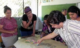 La Volontaire ONU Rita de Cassia Dutra, deuxième en partant de la gauche, et les professeurs du Salvador Hidalgo Cornejo School à Guadalupe, San Vincente, entrain d'élaborer des plans pour une école idéale. Cette activité s'inscrit dans le cadre du séminaire donné sur la réduction des risques de catastrophes, qui se tient deux fois par mois à l'école avec les professeurs et les membres de la communauté (Etel Matielo, 2011, programme VNU)