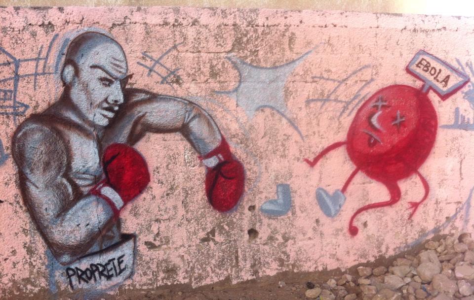 Graffiti boxant le virus Ebola r?alis? par l'ONG "Graff et Sant?" dans un quartier de Guediawaye, en p?riph?rie de Dakar, (Malyka Freyja Diagana Linguere, programme VNU, 2014)
