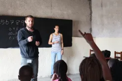 Les Volontaires ONU internationaux Rory et Phoebe dispensant des cours d'anglais (Fabien Faivre, programme VNU, 2015)
