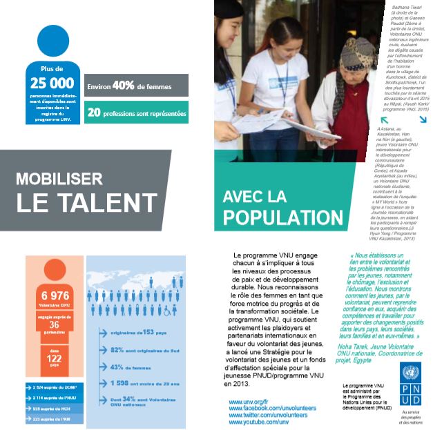 Plus de 82 % des Volontaires ONU sont issus des pays du Sud, et plus de 30 % sont affectés dans leur propre pays. Il existe également un service Volontariat en Ligne du programme VNU. Ce service met directement en relation les entités des Nations Unies, les organisations de la société civile et les institutions publiques avec des personnes motivées et expérimentées qui apportent leur soutien via Internet.