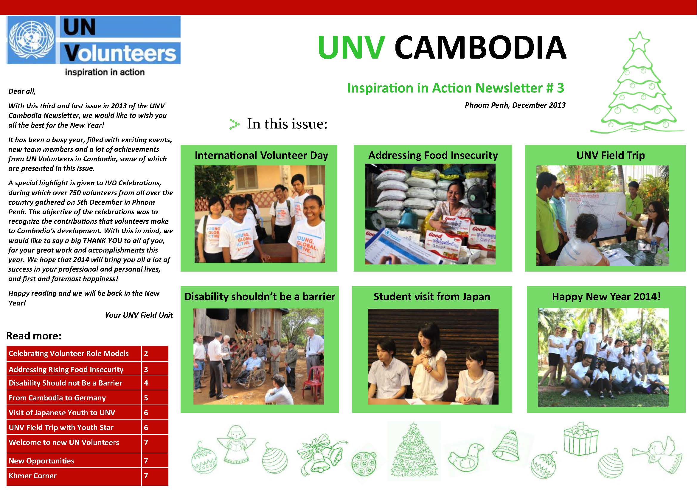 The United Nations Volunteers (UNV) programme in Cambodia published its third and last newsletter in 2013, taking a special look at the country's International Volunteer Day (IVD) celebrations, during which over 750 volunteers from all over Cambodia gathered on 5th December in Phnom Penh to recognize the contributions that volunteers make to Cambodias development.