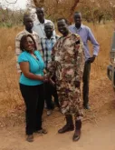 During a recent UNMISS mission in South Sudan?s Lake States, Lillian Amondi Bondi UNV Civil Affairs Officer (left), shakes hands with a National Monitor with the Sudan People?s Liberation Army. Her colleagues included a Disarmament, Demobilization and Reintegration officer (far right) and language assistants from the Civil Affairs Division, Office of the High Commissioner on Human Rights and UN Police. (UNV, 2012)