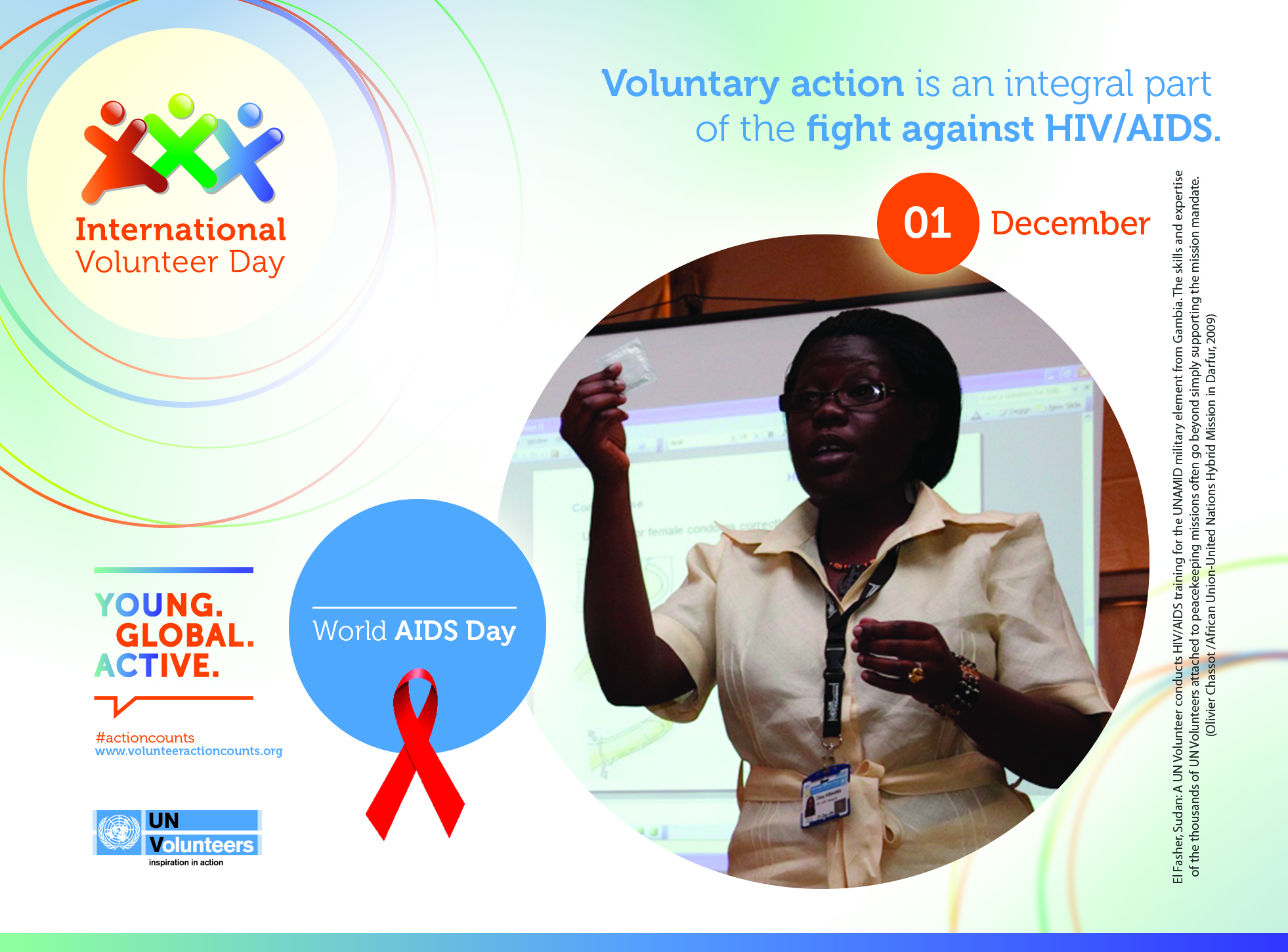 World AIDS Day is marked on 1 December each year and is an opportunity for people worldwide to unite in the response against HIV/AIDS, show our support for people living with HIV/AIDS and to commemorate people who have fatally suffered from this epidemic. Everyone has a right to live a full and productive life with dignity. With International Volunteer Day (IVD) approaching on 5 December, the United Nations Volunteers (UNV) programme invites you to take action. Let us generate public support for ending discrimination against people living with HIV/AIDS.