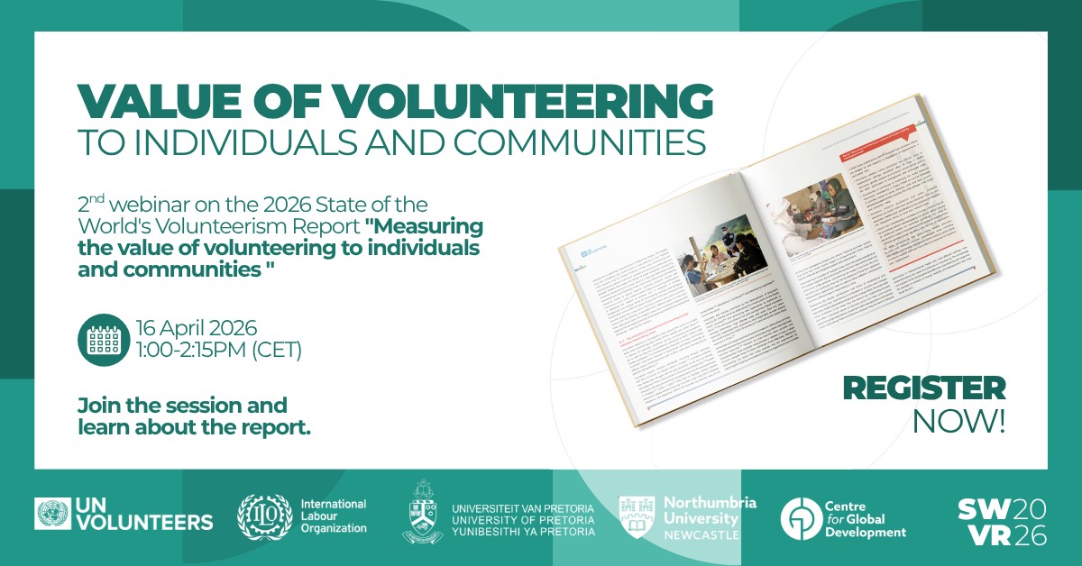The SWVR Global Webinar Series forms part of the United Nations Volunteers (UNV) wider dissemination and engagement efforts. The series will unpack the report’s key findings, explore its analytical frameworks and tools, and support regional and country‑level rollout through established UN and partner processes.