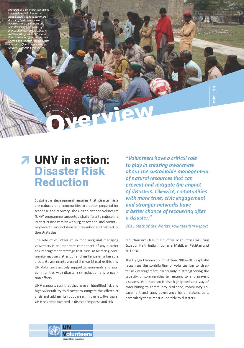 Sustainable development requires that disaster risks are reduced and communities are better prepared for response and recovery. The United Nations Volunteers (UNV) programme supports global efforts to reduce the impact of disasters by working at national and community level to support disaster prevention and risk reduction strategies.
