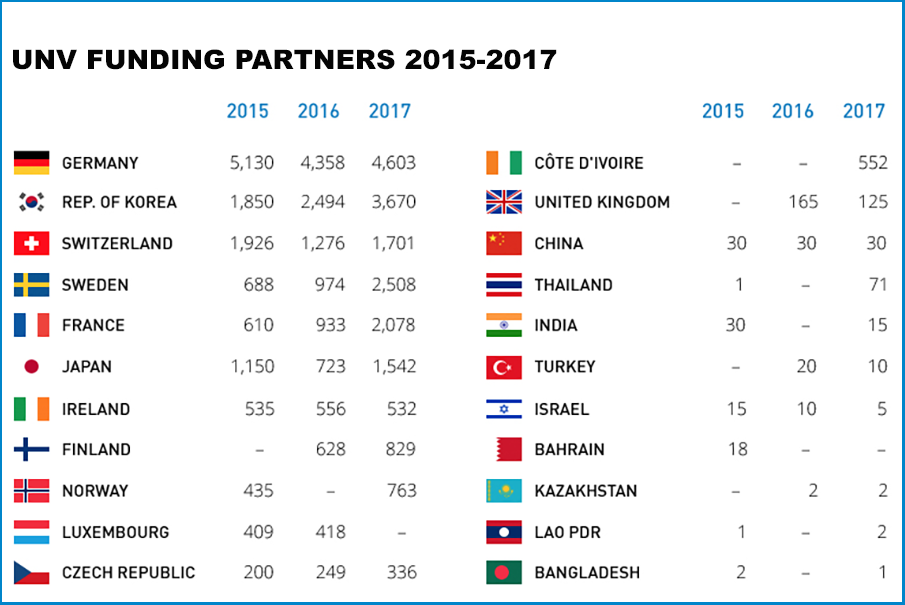 United Nations Volunteers (UNV) relies on voluntary contributions from UN Member States and funding partners. These enable UNV to promote volunteerism and deploy UN Volunteers, who assist United Nations partners in delivering on their mandates and the 2030 Agenda for Sustainable Development.