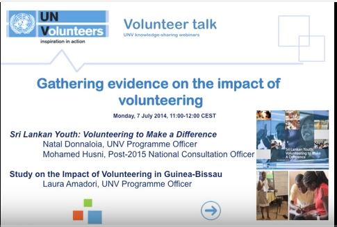 The second “Volunteer Talk – UNV Knowledge Sharing Webinar” was organized on 7 July 2014, with the theme “Gathering evidence on the impact of volunteering". The webinar featured experiences from the field in carrying out research studies on volunteering. Presentations by the guest speakers – Natal Donnaloia and Mohammed Husni from Sri Lanka, and Laura Amadori from Guinea Bissau – were followed by vivid interactions with the nearly 70 webinar participants. Video edited by: UN Online Volunteer Amy Ozeri